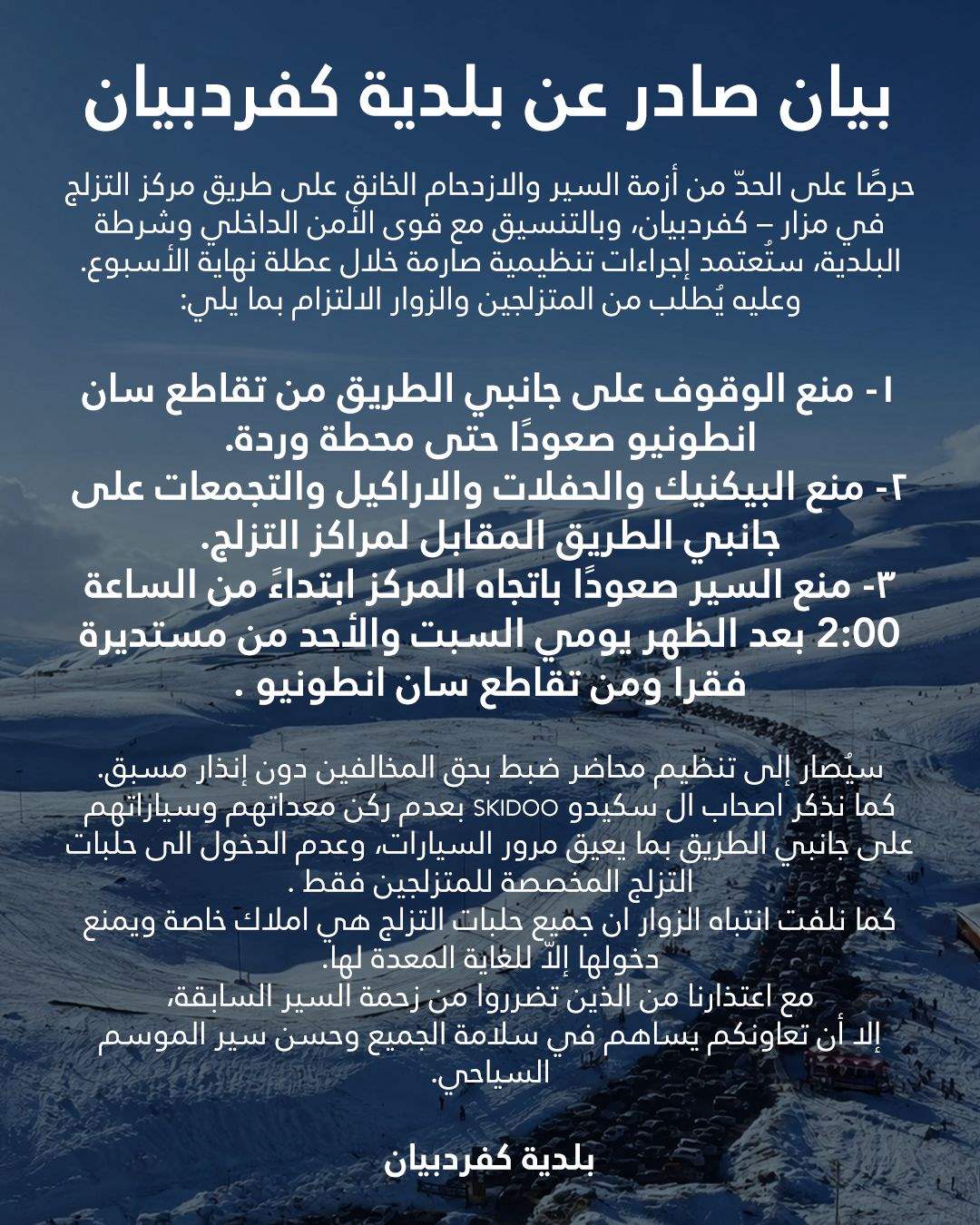 أعلنت بلدية كفردبيان أنه "حرصًا على الحد من أزمة السير والازدحام الخانق على طريق مركز التزلج في مزار - كفردبيان، وبالتنسيق مع قوى الأمن الداخلي وشرطة البلدية، ستعتمد إجراءات تنظيمية صارمة خلال عطلة نهاية الأسبوع. وعليه يطلب من المتزلجين والزوار الالتزام بما يلي: