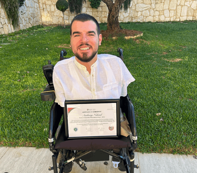 وروى أنطوني أن "بعد أن ولدت وفهم أهلي وضعي قررا أنه يجب التعامل معي كأي شخص آخر، قاما بتربيتي وعلماني ولم يكن الطريق سهلا أبدا، اضطررت أن أتلقى دروسي أول فترة من المنزل، وكنت فقط أقدم امتحاناتي في المدرسة، وبعدها انتقلت الى الجامعة، وأصريت على أن أحضر شخصيا الى حرم الجامعة وأن أقوم بتأسيس نفسي، وأن يكون تعاطيّ مع الناس حضوريا، ومن هناك انطلقت، نلت شهادة بكالوريوس في علوم الكمبيوتر، وبعد كورونا بدلت مسيرتي المهنية واليوم أنا Motivational Speaker (مخاطب تحفيزي)، Mindset Coach  (مدرب عقلية) و Learning and Development Specialist (أخصائي تعلم وتطوير) في شركة Monty Holding."