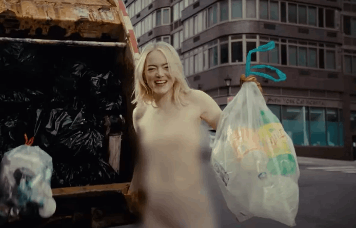 وانبهرت إيما، بدعم من بوين يانغ وفريق SNL، عندما تفاخرت بشخصيتها المذهلة وهي لا ترتدي سوى زوج من القفازات في الجزء الموسيقي المسجل مسبقًا. ويظهر في المقطع إيما وبوين يقتحمان أغنية حزينة حول سوء حظهما، ولكن هناك شيء واحد مقدر له أن يبهجهما: "الركوب على الجزء الخلفي من شاحنة قمامة عاريين تمامًا في وسط مدينة نيويورك في الساعة 11 صباحًا"، وفق ما نقل موقع