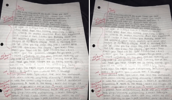 أرسلت له حبيبته رسالة اعتذار عن خيانتها... فنشرها مصححة مع ملاحظات باللون الأحمر!
