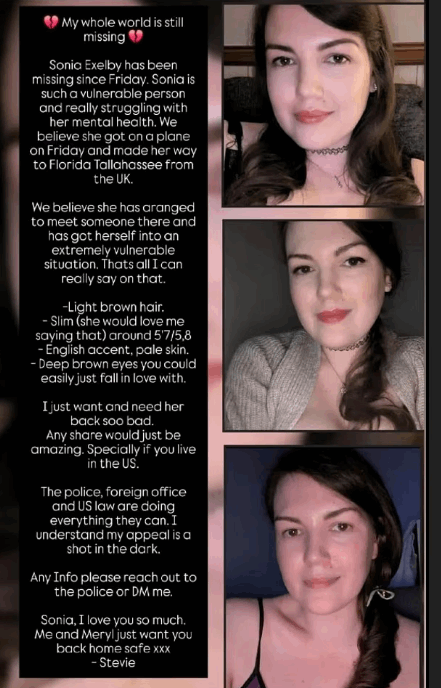 وفي التفاصيل، كانت سونيا، وهي صانعة محتوى رقمي من بورتسموث، قد سافرت إلى الولايات المتحدة في 10 تشرين الأول، وكان يفترض أن تعود إلى بريطانيا في 13 من الشهر نفسه. لكن غيابها عن رحلة العودة دفع عائلتها وصديقها إلى الإبلاغ عن اختفائها، لتبدأ شرطة فلوريدا تحقيقًا موسّعًا بعد تعقّب حجوزاتها وسجل هاتفها.
