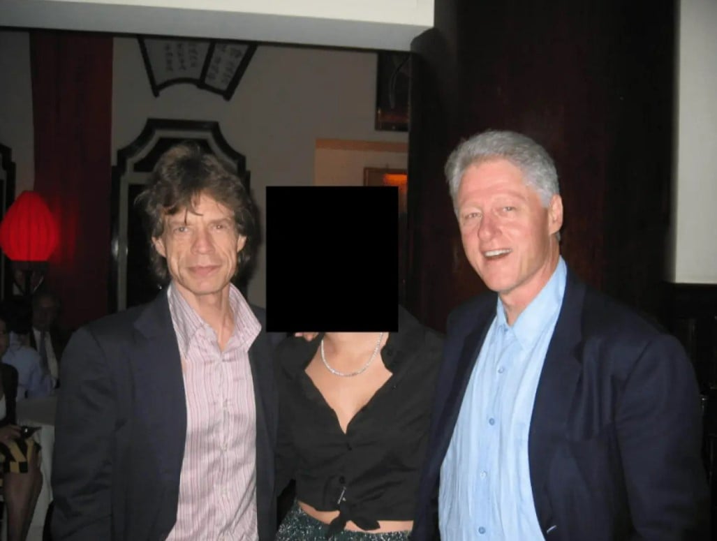 -ميك جاغر: تضم الصور مشاهد لزعيم فرقة رولينغ ستونز وهو يتناول العشاء مع إبستين وكلينتون، إضافة إلى لقطة أخرى مع امرأة جرى طمس ملامحها.