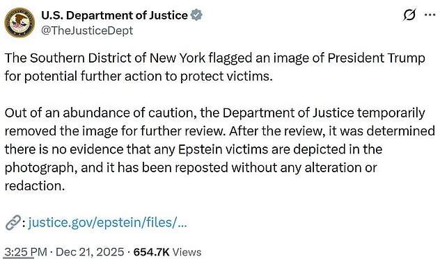 وأوضحت وزارة العدل في بيان عبر وسائل التواصل الاجتماعي أن الصورة أُزيلت موقتًا "من باب الحيطة وحماية الضحايا"، مؤكدة أنه بعد المراجعة "لم يُعثر على أي دليل يشير إلى أن الصورة تتضمن ضحايا لإبستين"، لذلك أُعيد نشرها من دون أي تعديل.