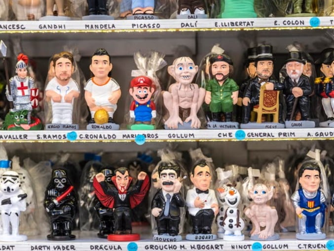 تشتهر كتالونيا بتقاليد غريبة أبرزها "كاغا تيو" أو "الجذع المتغوّط". قبل العيد بأسبوعين، يوضع جذع خشبي مبتسم على الطاولة ويُطعَم يومياً، ثم يُضرَب بالعصي ليلة الميلاد ليُخرج الهدايا. كما تنتشر دمية "كاغانير" التي تظهر في مشاهد الميلاد بوضعية غير مألوفة، وغالباً ما تُصنع على هيئة مشاهير.