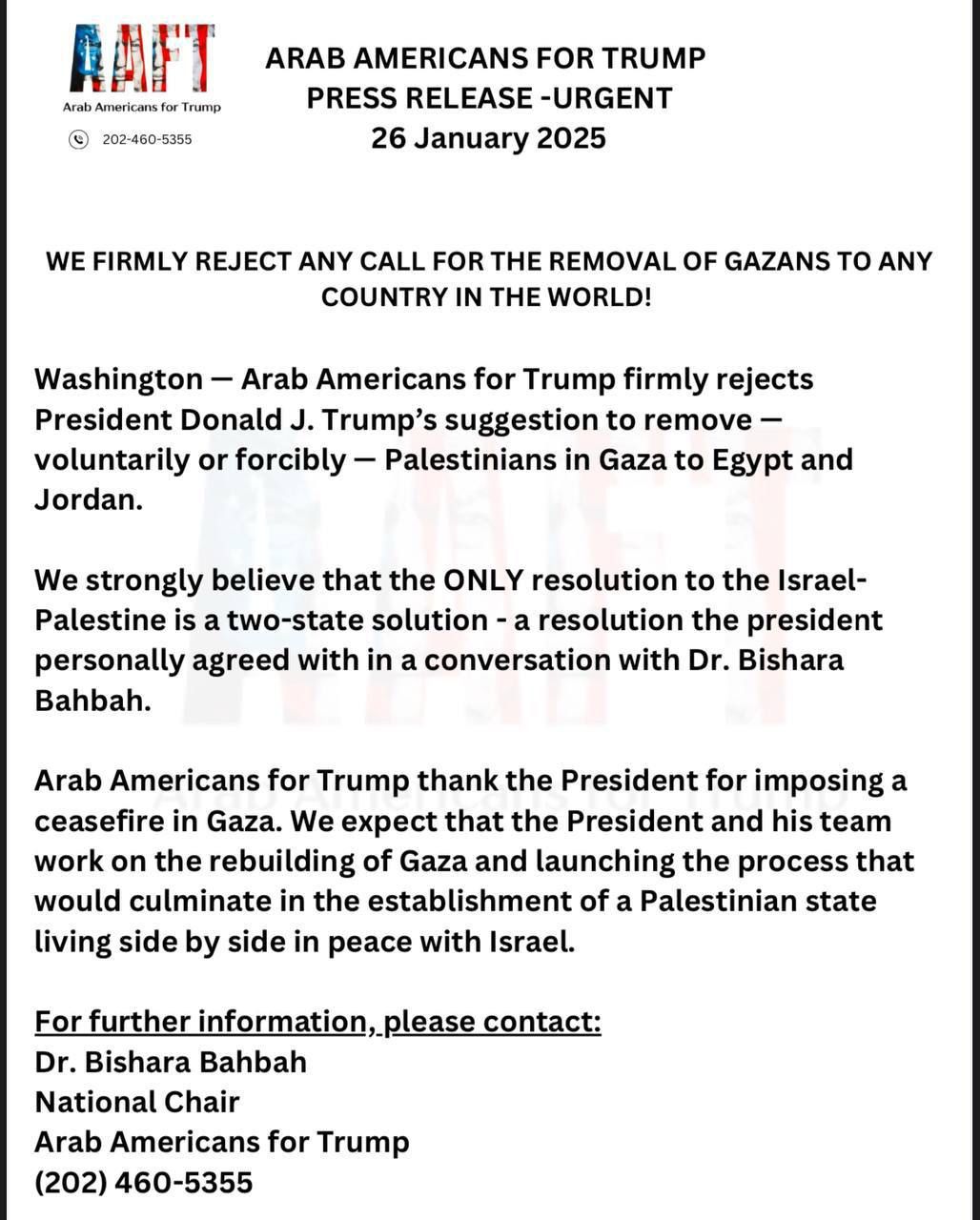 أصدر "العرب الأميركيون من أجل ترامب" بياناً يرفضون فيه بشدة أي دعوة لنقل سكان غزة إلى أي بلد في العالم.