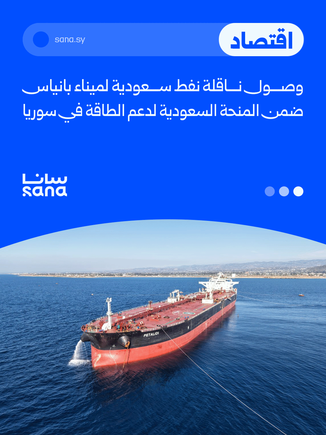 أفادت وكالة الأنباء السورية (سانا) بوصول ناقلة النفط السعودية PETALIDI إلى ميناء بانياس البحري محملة بـ90 ألف طن من النفط الخام وذلك في إطار المنحة السعودية المقدمة لسوريا والتي تهدف إلى دعم الاحتياجات المحلية وتعزيز التعاون الاقتصادي والتنموي بين السعودية وسوريا.