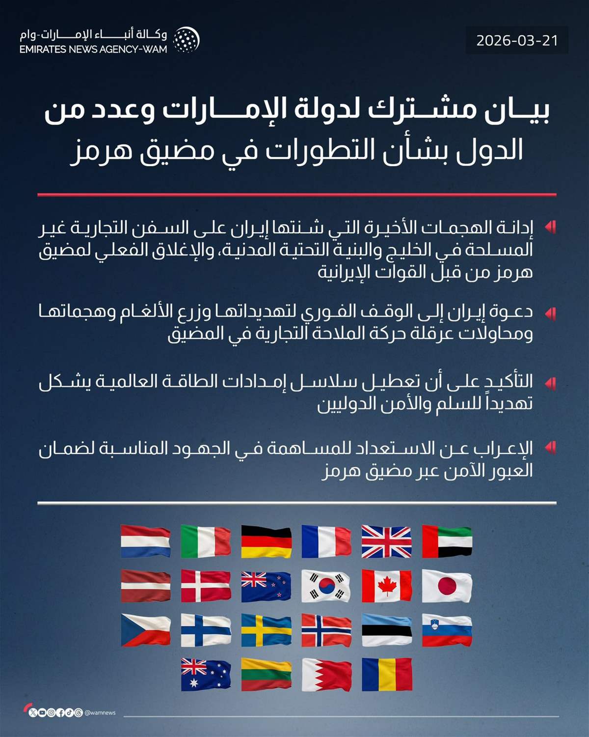 وقالت 22 دولة، غالبيتها أوروبية بالإضافة إلى البحرين والإمارات: "نعرب عن استعدادنا للمساهمة في الجهود المناسبة لضمان المرور الآمن عبر المضيق"، مضيفة: "نرحّب بالتزام الدول المشاركة في التخطيط التحضيري".